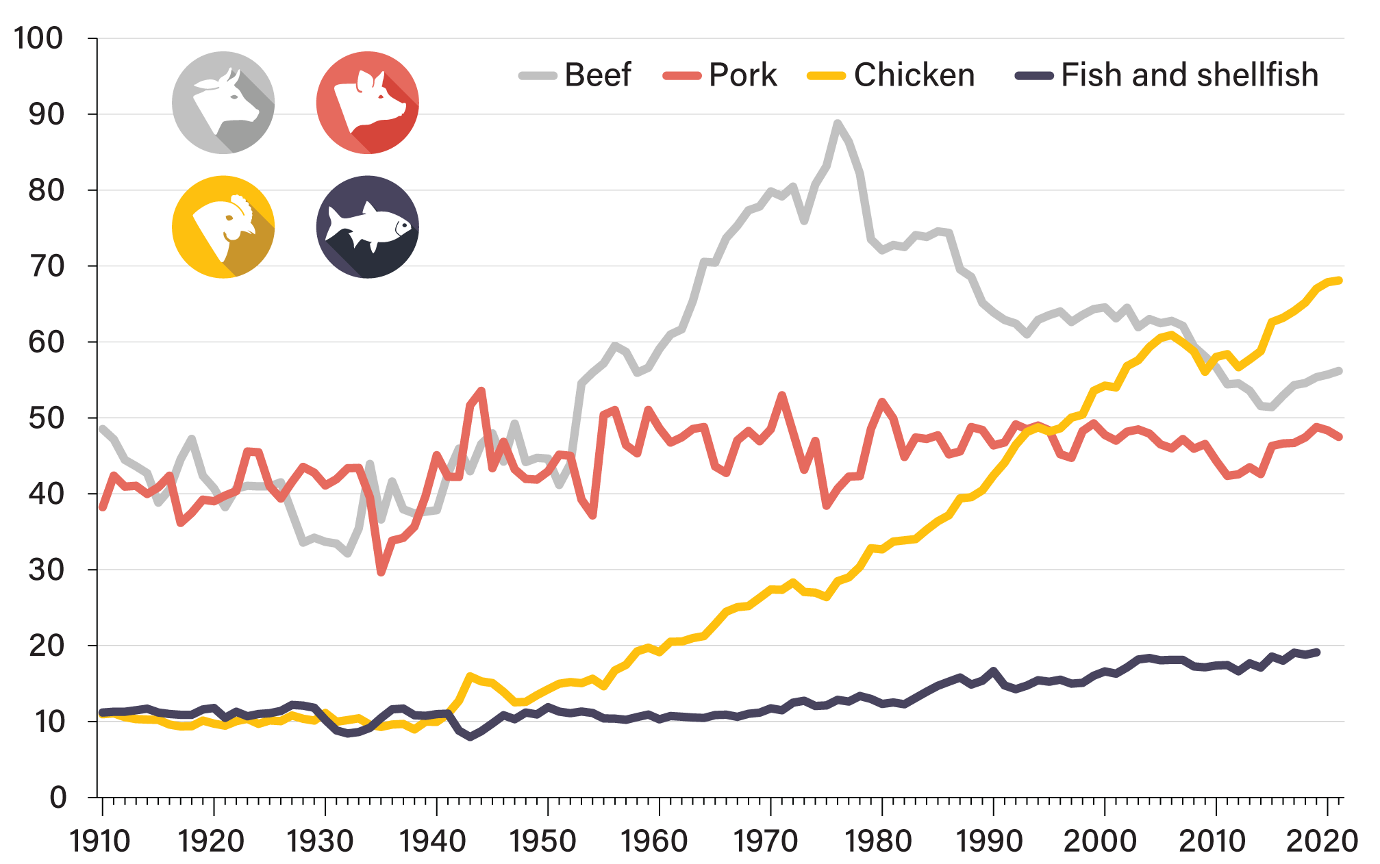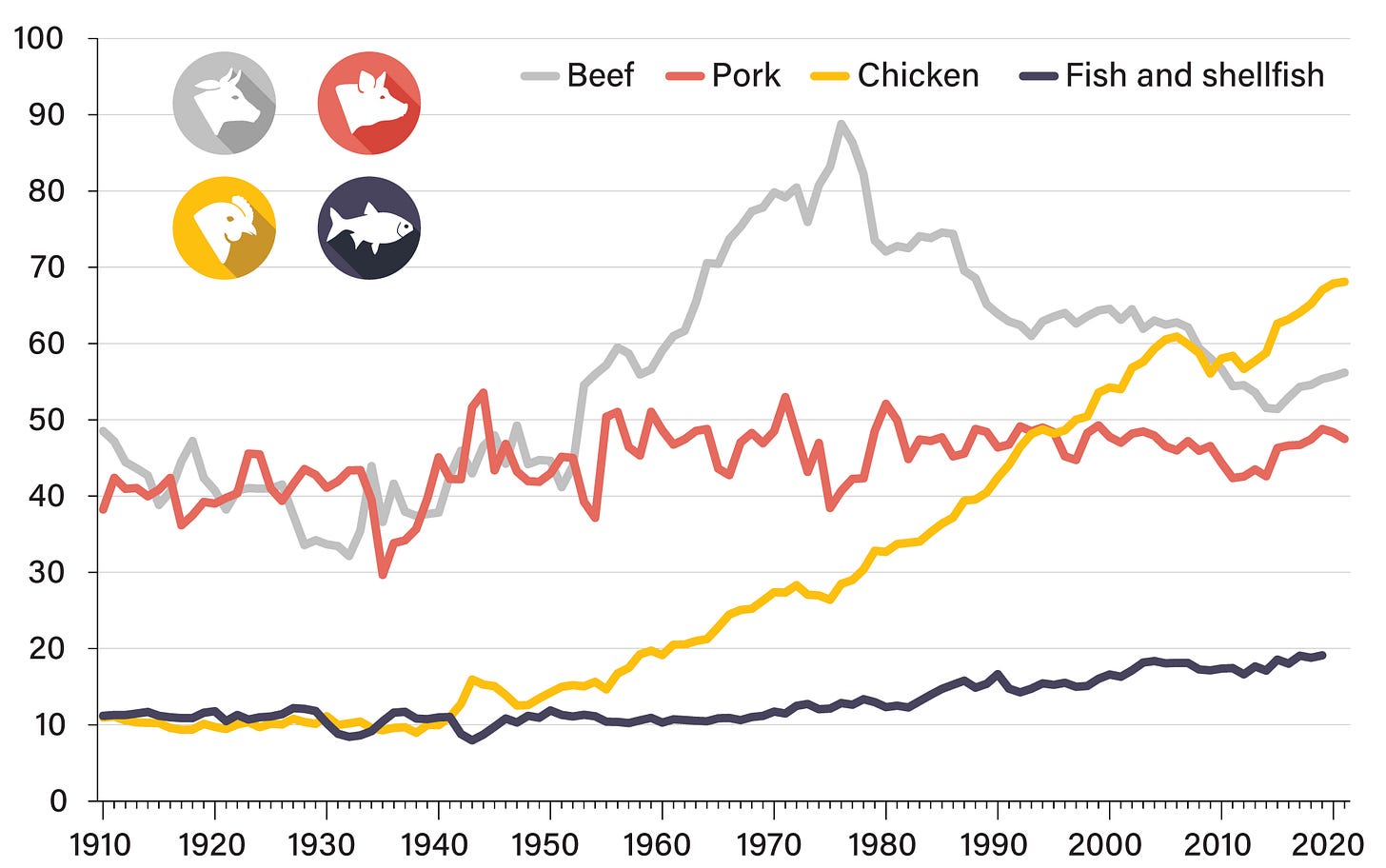 While the consumption of beef, the most popular red meat, continued to grow in the prosperous years after World War II, it peaked in the 1970s and has rapidly declined since. On the other hand, chicken consumption has been growing steadily since World War II. During the Great Recession of 2007 to 2009, chicken overtook beef as the most consumed animal protein.