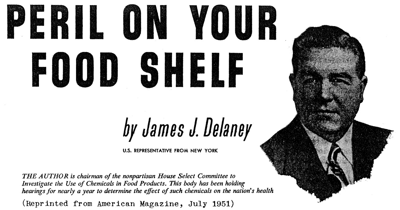 The quote above is from U.S. Representative James Delaney in 1951, the year following the start of Delaney’s House Select Committee’s years long investigation into the glaring lack of safety in food additives.